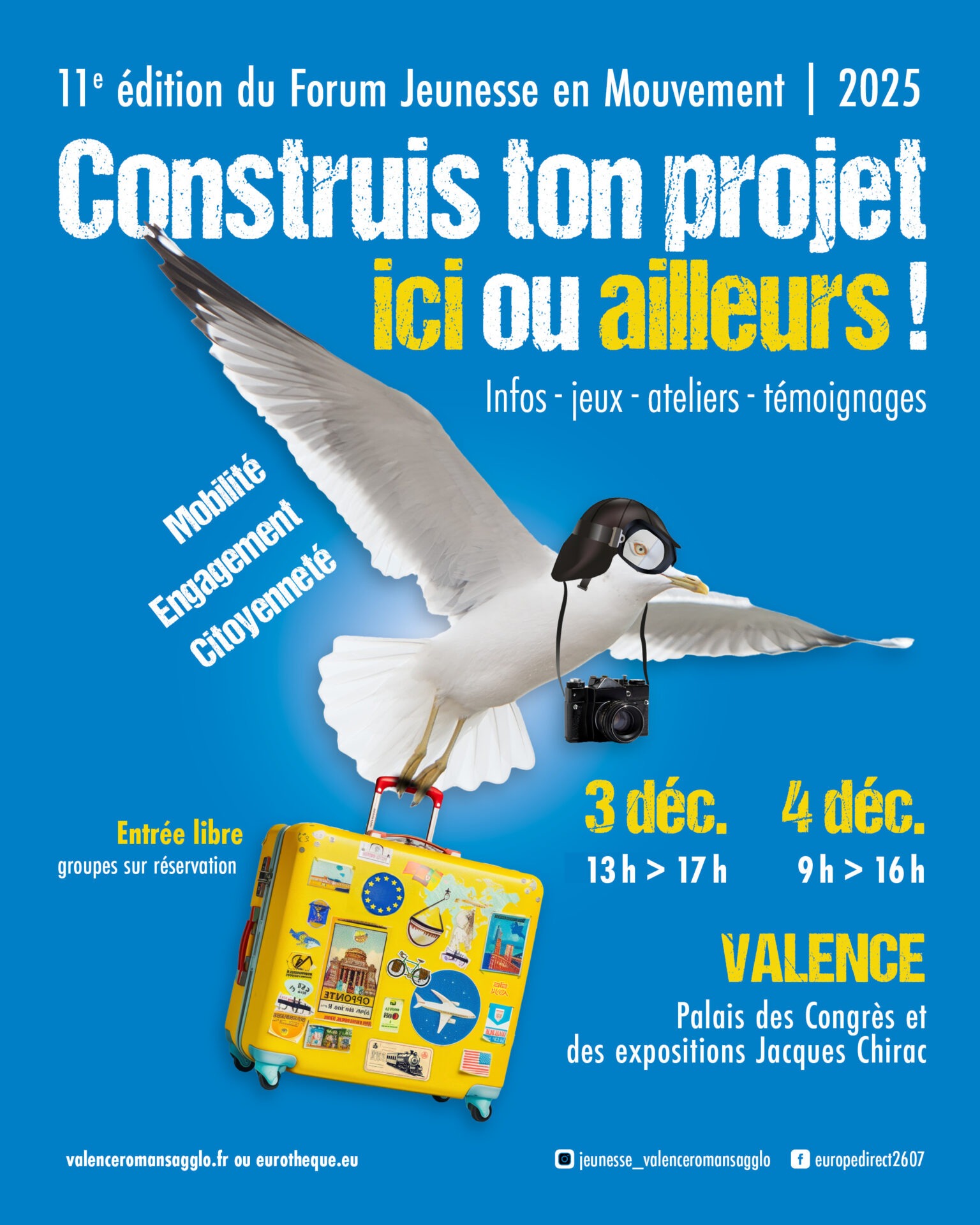 Un forum pour les jeunes de 11 à 30 ans, scolarisés ou non, demandeurs d’emploi, ou même aspirants voyageurs, permettant de découvrir toutes les opportunités pour s’engager, sur un projet local ou plus lointain, et partir en Europe ou dans le monde. (Stage, emploi, job, études, chantiers internationaux, …) Une trentaine de partenaires vous accueillent sur 4 pôles d’informations Au programme : – Mercredi 3 décembre : o Ateliers en accès libre : budget, santé, CV en anglais, Corps Européen de Solidarité … o Focus sur le Corps Européen de solidarité : ou comment partir en Europe sur une mission d’intérêt général – Jeudi 4 décembre : Focus sur la mobilité au Canada : 5 exposants vous informent pour partir en toute sérénité outre Atlantique : Tout savoir sur l’assurance maladie, le visa, les conditions financières…